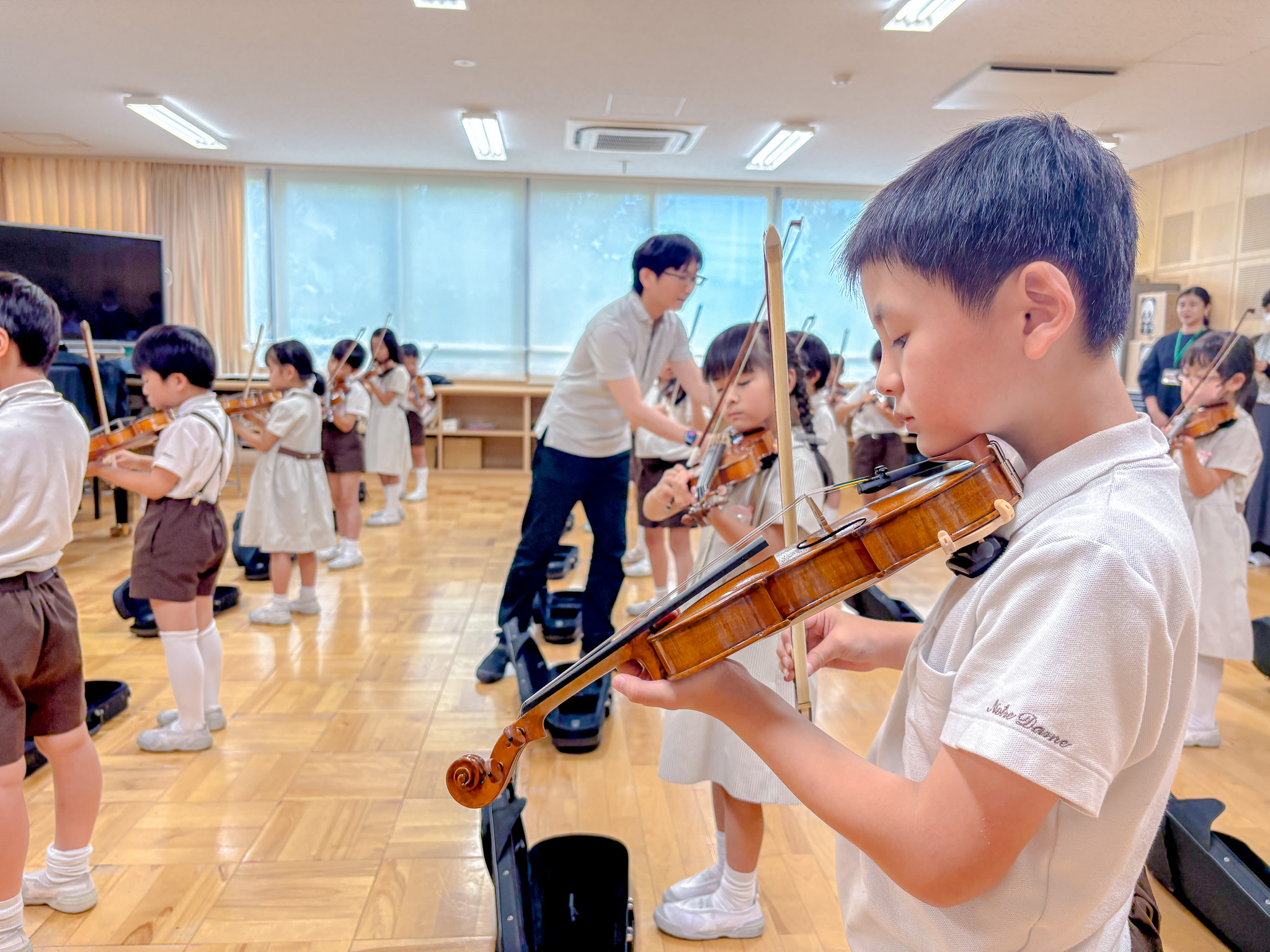 専科教員に加え、プロのピアニストやヴァイオリニストから直接指導を受ける充実した環境があります。京都コンサートホールでの音楽会では、一流の音響に包まれながら感性を研ぎ澄まします。1・2年生にはヴァイオリン、4・5・6年生にはお箏と、本物に触れて演奏することで、音楽の深みを体感します。