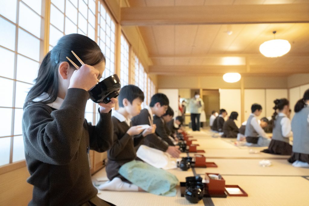 たん熊北店の栗栖様をお招きし、本格的なお出汁作りから茶懐石の作法まで学ぶ貴重な機会を設けています。この学習を通して、小学生のうちから本物の味を知ることで、豊かな味覚と食文化への理解を育みます。また単なる食事マナーにとどまらず、その背景にある日本文化の精神性についても深く学びます。