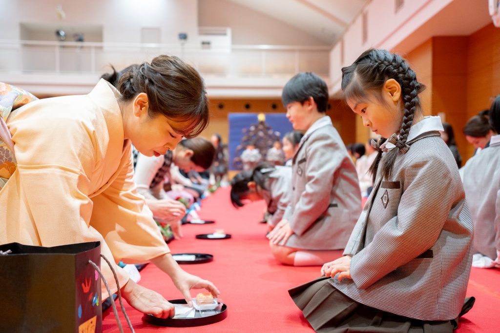 年3回の礼法学習では、専門研修を受けた教員からの直接指導を行います。この取り組みは全国的にも珍しく、日常的な礼儀作法から茶道の精神まで一貫した指導を実現しています。