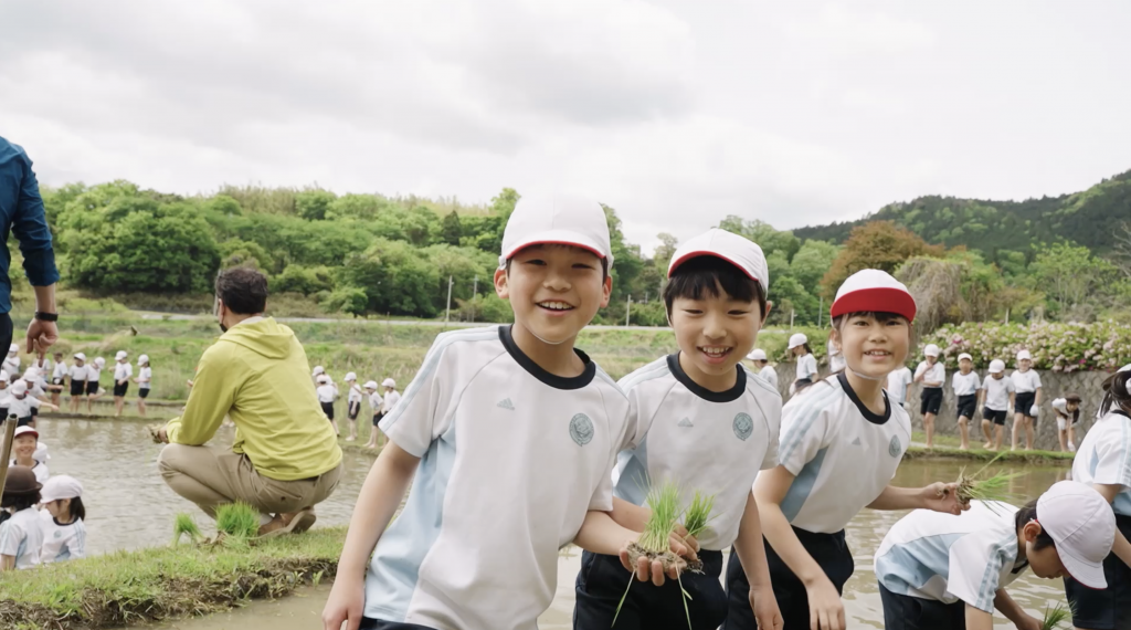 4年生では、稲作について社会科で学習し、農家さんの手をお借りして、山の家で実際に稲を栽培します。収穫したお米はND米として、保護者に販売したり、教会に寄付したりするなど、その利用方法まで自分たちで考えます。