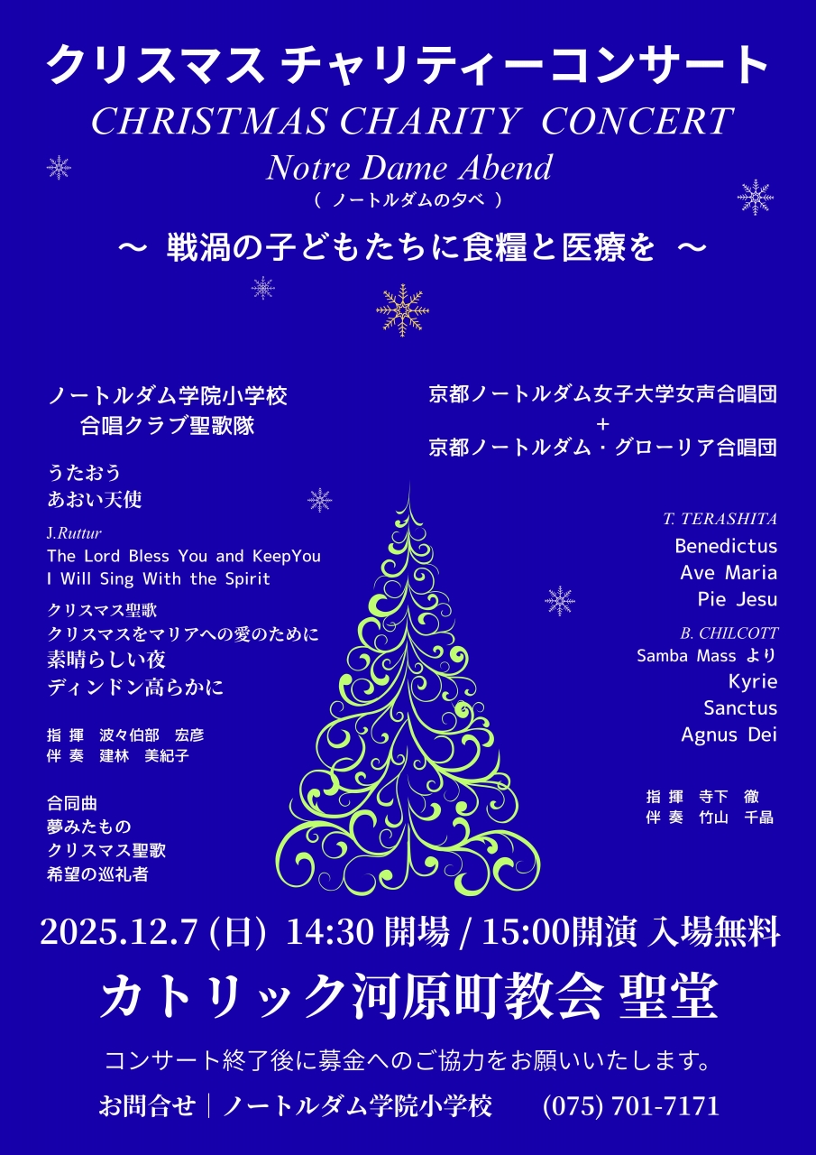 この度カトリック河原町教会にて行われました、ノートルダムファミリーの各合唱団によるクリスマス・チャリティーコンサートは、おかげさまで河原町教会聖堂いっぱいのお客様にお越しいただきました。