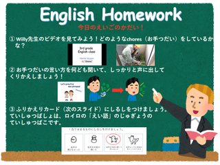 本校オリジナル動画ビデオは、先生たちのアイデアいっぱいでとても楽しいものになっています。例えば、1年生ではAlex先生がご自慢のLegoコレクションを見せながら数の紹介をし、3年生で、Willy先生が実際に家でのお手伝いの様子を見せ、4年生では、Toby先生は自分のマンションにみんなを招待して一日の生活を見せるなど、工夫がされています。