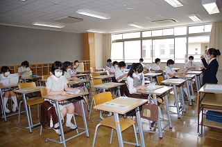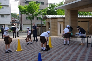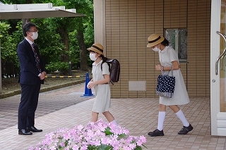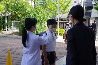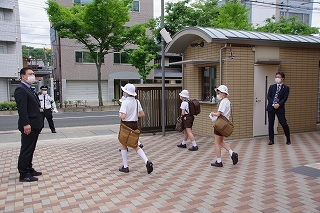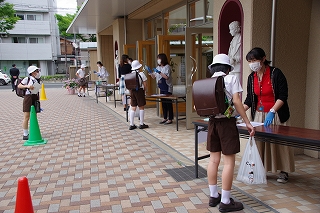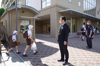 教職員一同、この日を楽しみに待っていました。安全に登校し、安心して学校生活を送れるよう、手分けして子ども達をサポートします。校門で校長先生に出迎えられた子ども達は、クラスごとに体調と体温の確認を受けてから校舎に入りました。