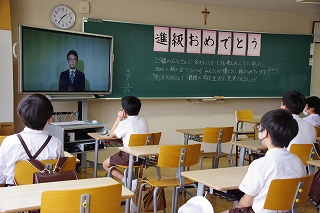 始業式はテレビを通して行いました。新しい先生の紹介の後、校長先生の話を聞きました。始業式の最後に「新型コロナウイルス感染症に苦しむ世界のための祈り」を共にささげました。