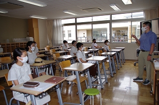 今年度になって児童が登校したのは4月上旬の入学式だけで、それ以来新型コロナウイルスの影響でずっと休校が続いていました。2年生以上の子ども達は今週が進級してから初めての登校日です。初日の今日は、6年生がクラスの半数ずつ午前と午後に分かれて登校しました。