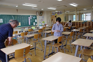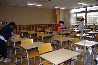 子ども達の登校の前後には、手分けして、机やいすなどの消毒を行っています。