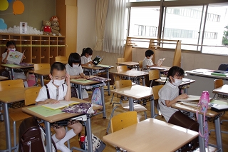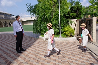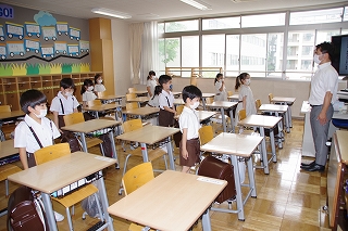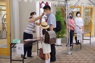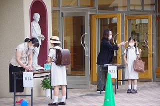 月曜日の6年生から始まり、最終日の土曜日には1年生が入学式以来の登校日を迎えました。保護者の方と一緒に次々と元気に校門をくぐってきてくれました。体調と体温の確認を受けてから校舎に入ります。保護者の方々も体温の確認にご協力いただきました。
