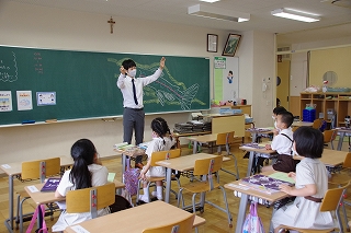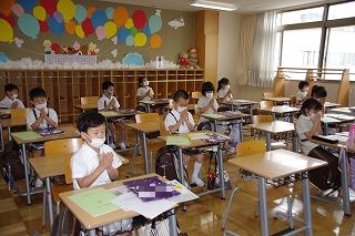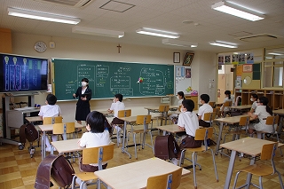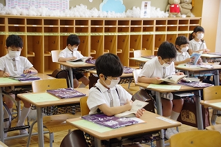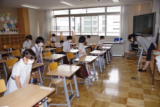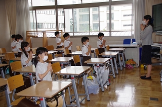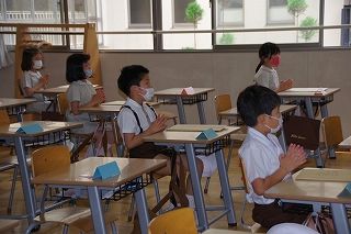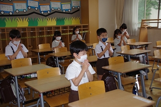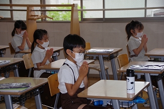 皆がそろったら、朝の祈りから始めます。入学式以来の登校とはいえ、オンライン授業のはじめと終わりに毎日お祈りをしていた子ども達はお祈りのことばをすでに暗唱していて、目を閉じて祈りをささげていました。