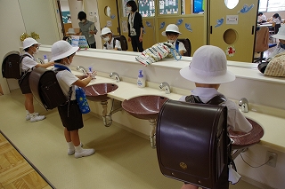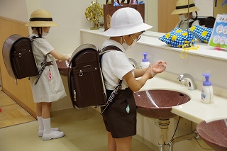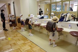 教室に入る前にまず手を洗うのが、新しい生活習慣です。子ども達は、お家の方やオンライン授業での先生達の話をよく守り、指の1本1本から手首まで、洗い残しのないようきちんと手洗いを行っていました。
