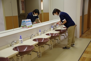 前半登校と後半登校の入れ替わりの合間、また1日の終わりには教室、水回りなどの消毒をしています。