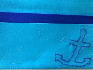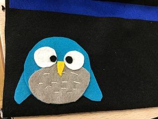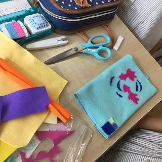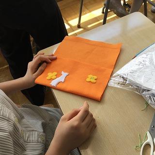5年生のブックカバー作りに続いて,思い思いのデザインをフエルトで作り,縫い付けたり刺繍したりしています。
