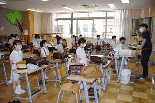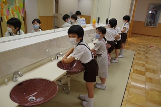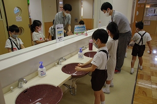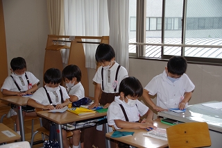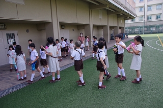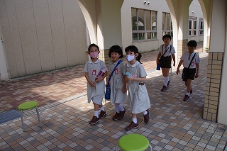 1年生と2年生は異学年パートナーとすごす時間を持ちました。屋内で、また屋外で、仲良く遊びました。屋外で遊んだ子ども達は水筒のお茶を何度も飲み、日陰を通って校舎に戻りました。教室に入る前に手洗いをする習慣がちゃんと身についています。2年生が1年生に優しく接する姿が印象的でした。