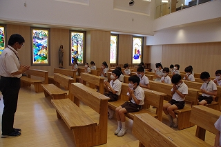 朝の祈りをささげた後、校長先生のお話を聞きました。学校に来られるということが当たり前ではないということをかみしめて、短いけれど充実した夏休みをすごそうと気持ちを引きしめました。