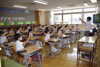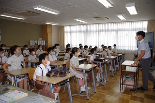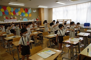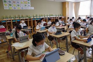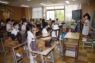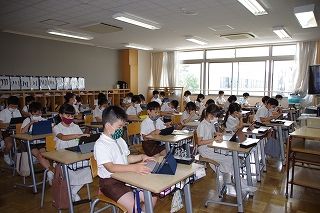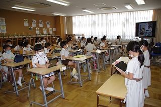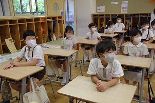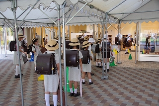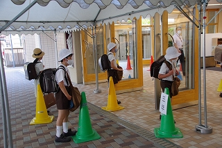 朝、子ども達は暑さに負けず元気に登校してきました。靴箱で上靴に履き替える際、密を避けるためにテントの下に並んで待つのは学校での「新しい生活様式」として定着しています。
