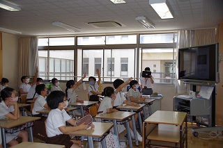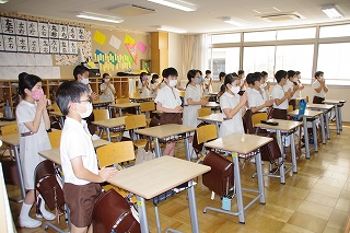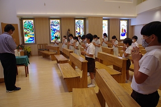 テレビ放送を通じて共に朝の祈りをささげた後、校長先生から、探究することの大切さについて、また今月、戦後75年を迎えたことについてお話を聞き、この夏休みをふり返りました。