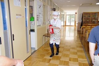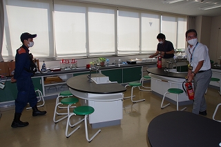 2時間目、火災報知器のベルが鳴りました。本館3階理科室から出火したとの想定で避難訓練をします。初期消火班の教職員は理科室にかけつけました。