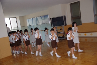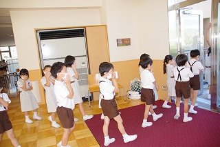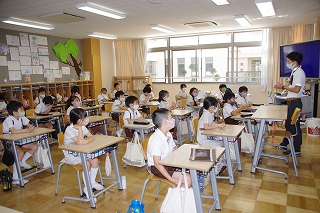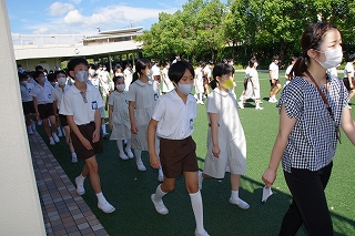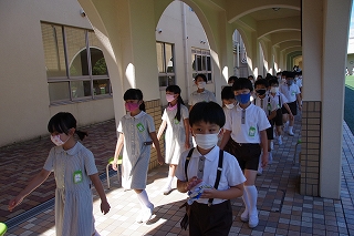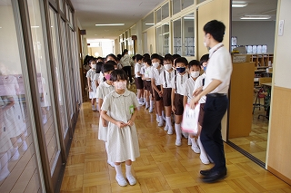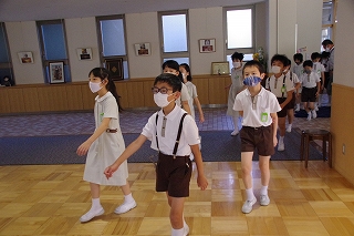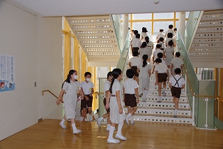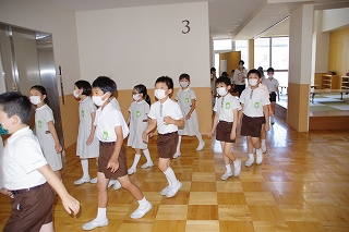 教室では、先生の指示に従って、子ども達が整列しました。今回は、全員がマスクをしているので、口と鼻を押さえるハンカチはなくてもよいということになりました。あわてることなく、落ち着いて避難します。