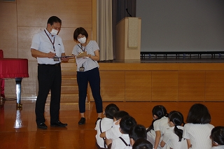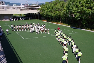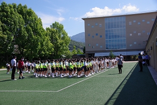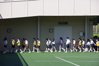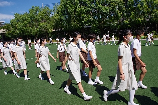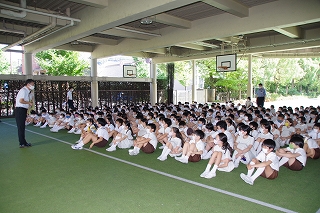 本来は全員が大運動場に避難するのですが、3密を避けるために、低学年は講堂へ、中学年は第2コートへ、高学年は小運動場へ避難しました。それぞれの場所から各クラス・学年の人数を報告し、全員無事に避難できたことを確認しました。