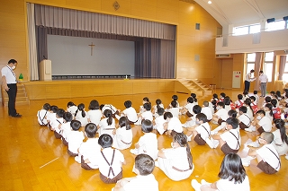朝の放送で校長先生、教頭先生からの話を聞いて、火災の時は下に逃げる、洪水の時は上に逃げる、ということを確認しました。