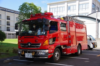 避難訓練の間も、実際の火事の通報が来たらすぐに出動できるよう、消防隊員のうちのお一人は消防車で待機しておられました。