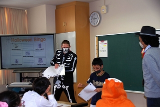 続いて、ハロウィーンにまつわる単語を復習しながら、ハロウィーンビンゴゲームをしました。引きあてたカードにかかれた絵をジェスチャーや英語の説明で出すヒントでクラスのみんなに当ててもらい、その単語でビンゴゲームをします。