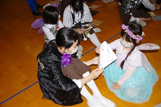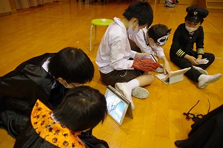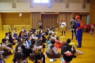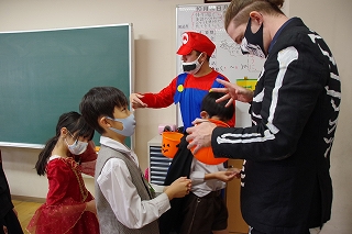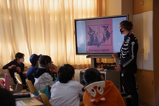 子ども達が何に扮装したかを英語で確かめて、ハロウィーンのスペシャルレッスンが始まりました。