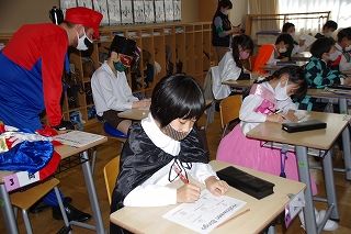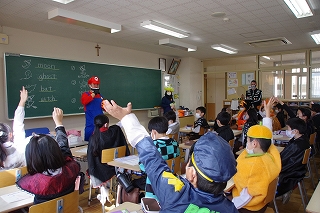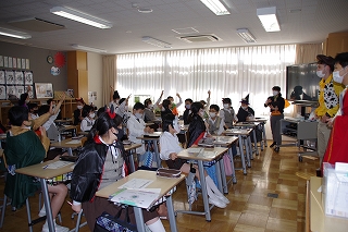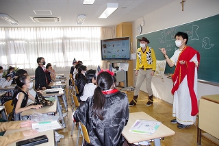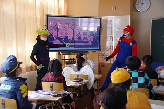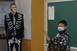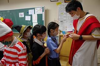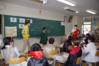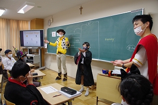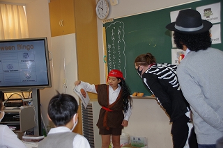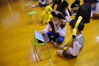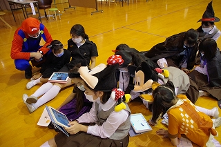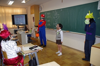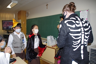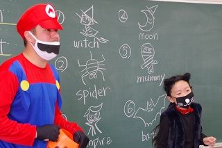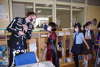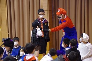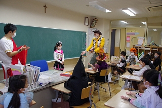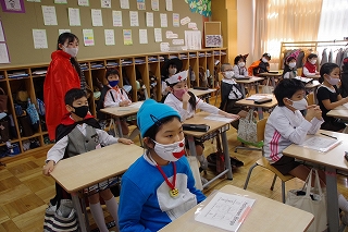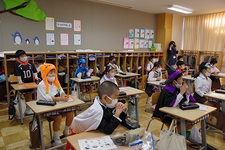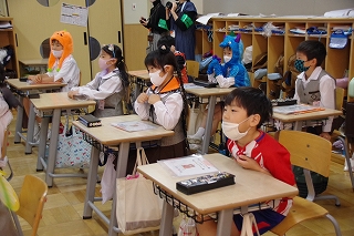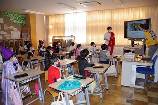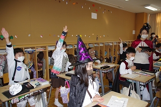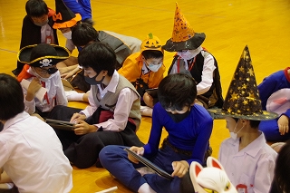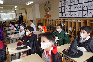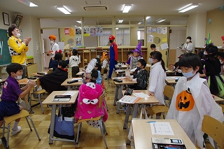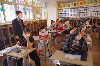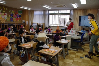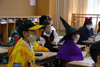 本校では英語の授業でハロウィーンについて学び、ハロウィーンを楽しみます。子ども達はお家の人と相談しながら手作りなどで用意した衣装で仮装して、ハロウィーンの英語の授業を受けました。