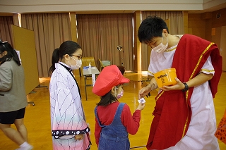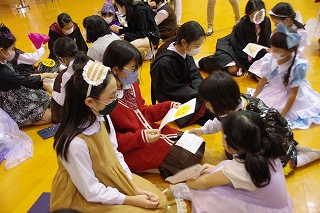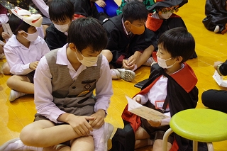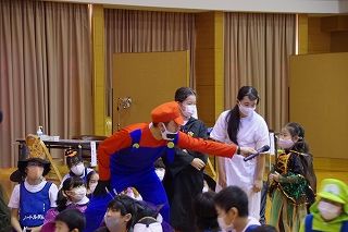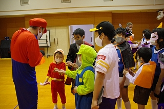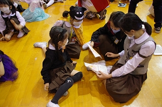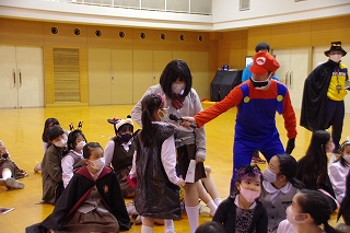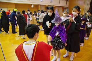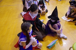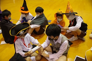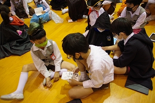 例年は違う学年のクラスと合同で集まって行うのが恒例のハロウィーンパーティーですが、今年は1年生と6年生のパートナークラスだけが一緒に講堂で行いました。