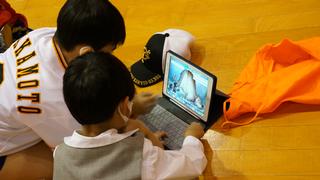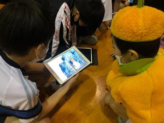 The 6th graders read the Halloween story to the 1st graders with their iPads.