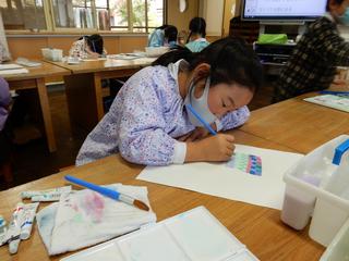 筆の種類を替えてみたり、筆のタッチを工夫したり、絵の具の濃さを考えてみたり、、。