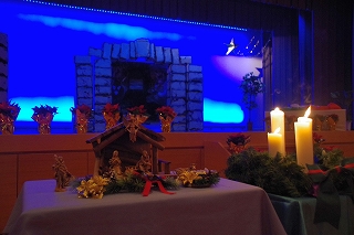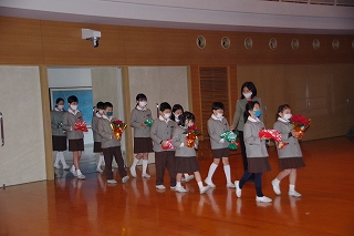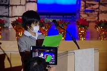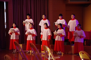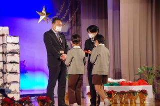 タブローの後、各学年の代表の子ども達も捧げ物(アドベントカード)を持って登壇しました。クリスマスを待つ待降節(アドベント)の間に人々のためにした小さな犠牲や良い行いを捧げます。