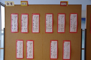 各クラスの金賞作品は2階コミュニティプラザに、銀賞作品は学年掲示板に、銅賞作品は教室に展示されています。
