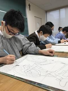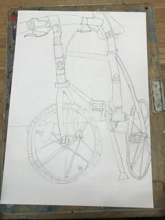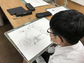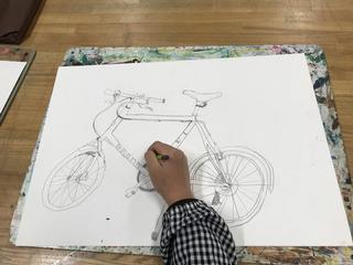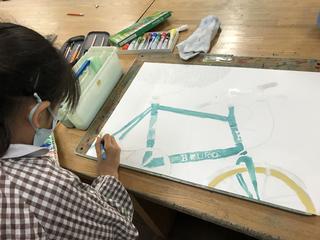 今、5年生の図工では「よく見て描く」をめあてに自転車をモチーフにスケッチをしています。正面から、後ろから自転車を描くのはとても難しいのですが、最初は、「先生、こんな難しいの、描けないわぁ」と不安を口にしたり、上手に描こうとしていたりする姿がありました。しかし、「上手に描く必要はないよ」「自転車のいいと思う部分から描いてみて」「大きさにこだわらなくていいよ」と声をかけると、いつの間にか夢中になり、のめり込んでいきました。背景は、その自転車があったらいいなあと思う風景を構想し描きます。空を飛んでいたり、高層ビルの前や、海の見える静かな場所だったり、自分の好きな場所にあったり。子ども達の自転車はいろいろな場所を旅しているようです。
