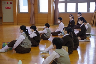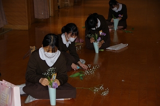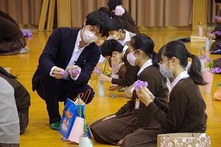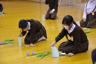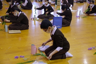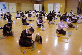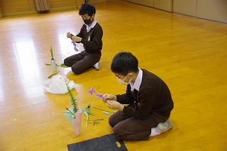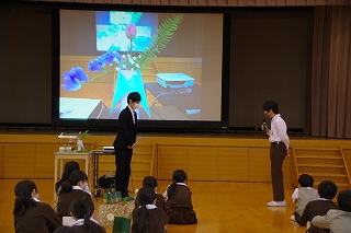 2月26日、6年生は卒業前行事の一環として、未生流笹岡家元 笹岡隆甫先生をお迎えし、いけばなについて学びました。