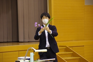 スイートピーの花の顔のどちらが正面か、いつも太陽の方に顔を向けていこうとする花の姿から学ぶことがあるということもお話しくださいました。また、日本ならではのアシンメトリー(非対称)の美しさなどの話も交えながら、いけ方を教えてくださいました。