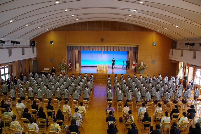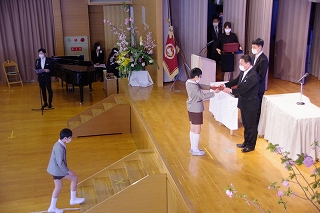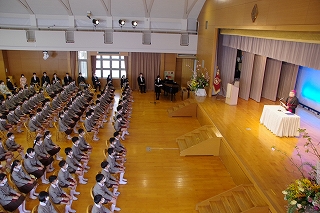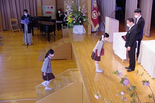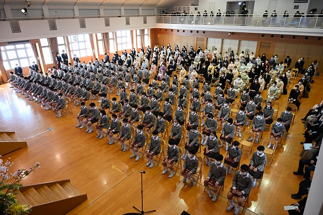 今年度の卒業式も昨年同様、新型コロナウイルスの感染拡大防止のため、来賓や在校生の出席を取りやめ、従来の卒業式よりも短い時間で行われました。出席される保護者の皆様にも手指の消毒とマスク着用をお願いし、細心の注意を払って実施しました。