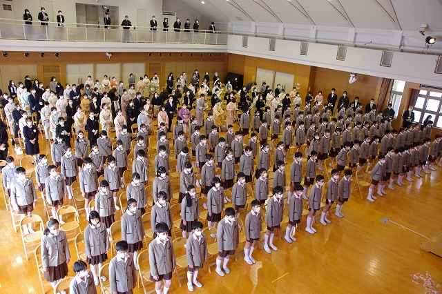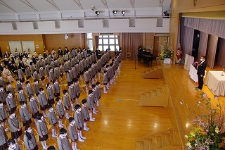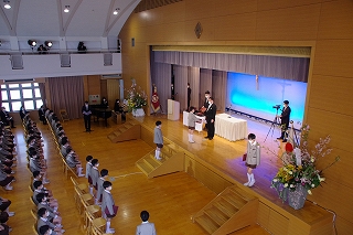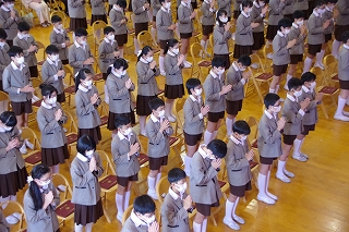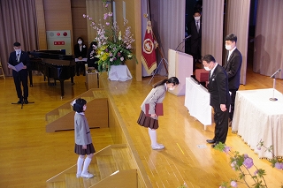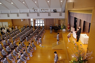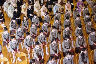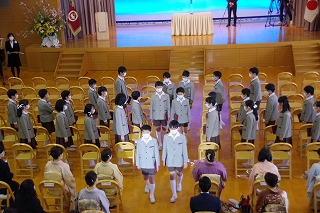 聖歌「神ともにいまして」に送られて、卒業生が退場します。それぞれのクラスで録音した音源を重ねた5年生の合唱の歌声も流れました。式に出席することができなかった5年生から卒業する6年生へのはなむけになりました。