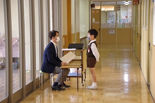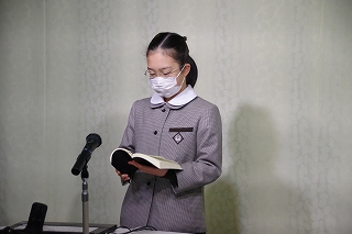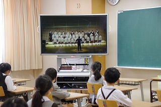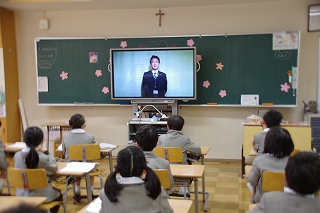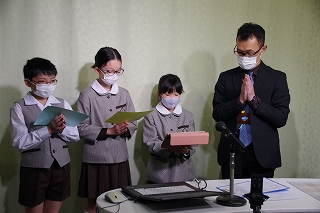 聖歌を歌う場面では、合唱クラブのコンサートホールでの歌唱ビデオを見ました。聖書朗読は代表児童がテレビスタジオで行いました。