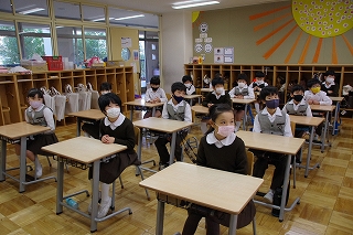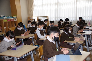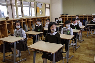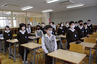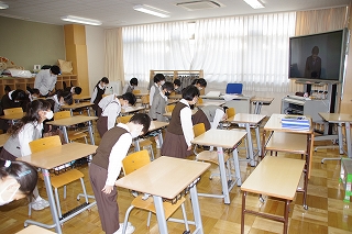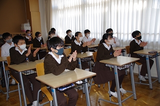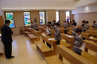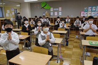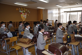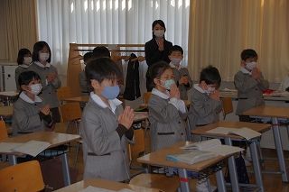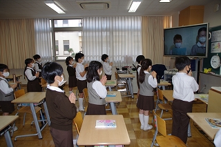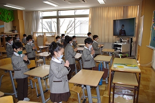 スタジオと各教室に分かれてはいますが、講堂で行う修了式と同様に朝の祈りから始めました。