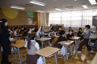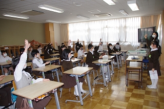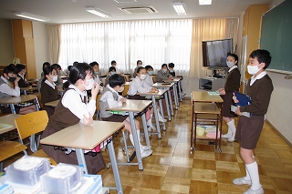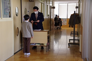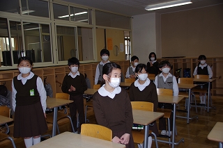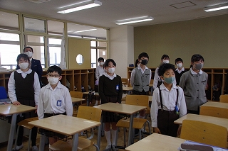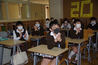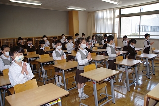 退職される先生方や転校する友達のあいさつもテレビを通して聞きます。今までの感謝を込めて拍手を送りました。