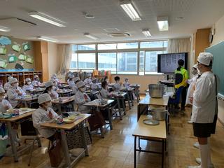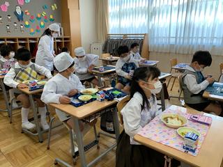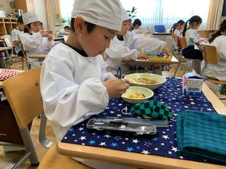 真新しい給仕エプロンを着け,6年生のパートナーにお手伝いをしてもらいながら,準備をしました。