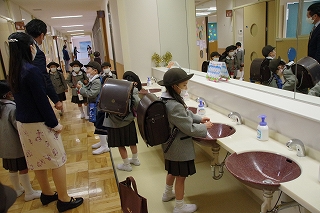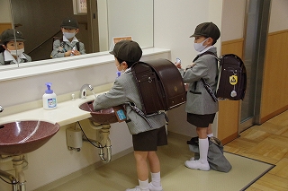 1年生も昨日の入学式に続き元気に登校し、教室に入る前にまず手を洗うという学校での”新しい生活様式”をさっそく実践していました。