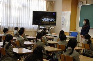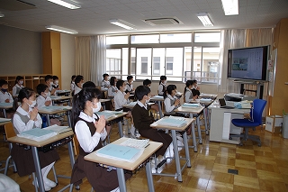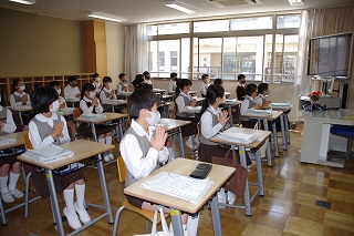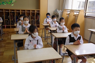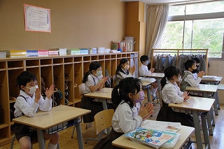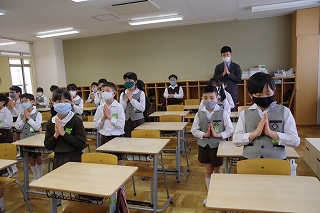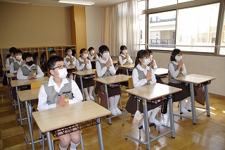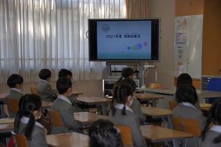 始業式はコロナウイルス感染予防の観点から今年度はテレビ放送で行いました。朝の祈りから始まります。