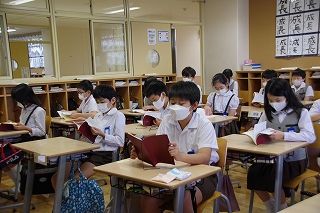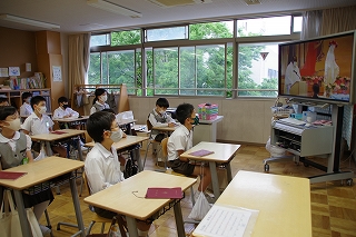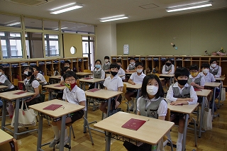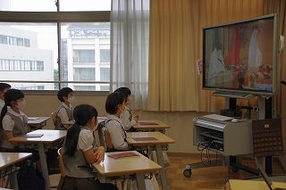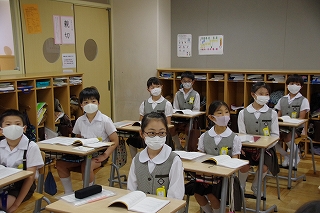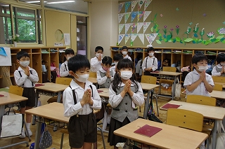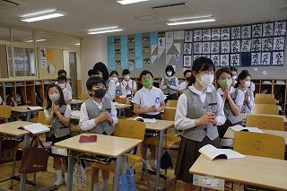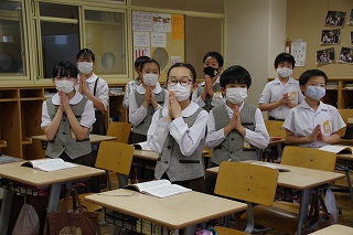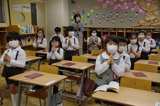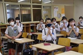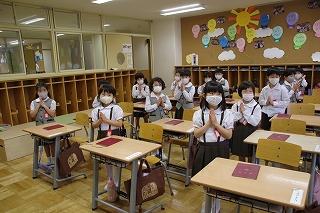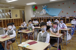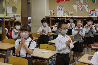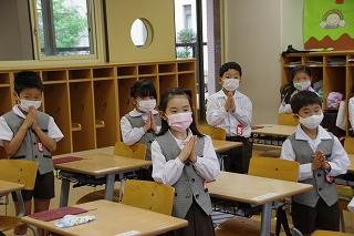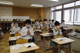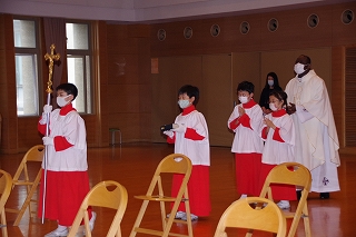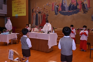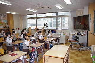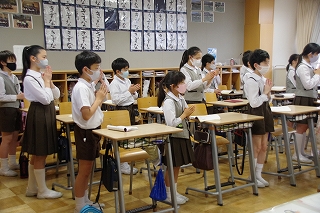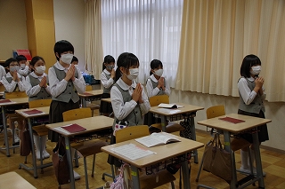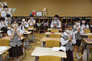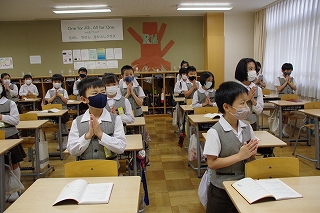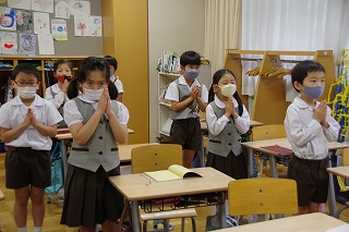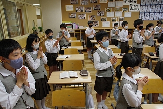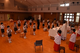 例年は講堂に集まって行っていますが、今年度は新型コロナウイルス感染予防の観点から、講堂には神父様と代表児童だけが集い、各クラスの子ども達はそれぞれの教室で校内テレビ放送を通して参加しました。