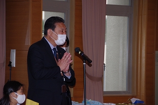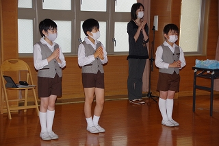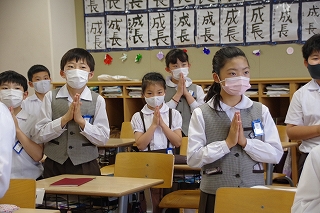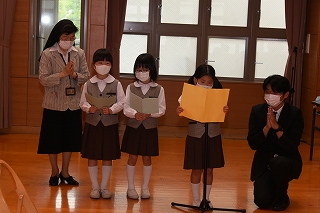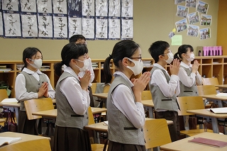 代表の児童が共同祈願を行いました。いただいた恵みに感謝し、世界の人々や困難の中にいる人々、今年は特に新型コロナウイルスで苦しんでいる方々や医療関係者の方にも思いを寄せ、皆で祈りました。