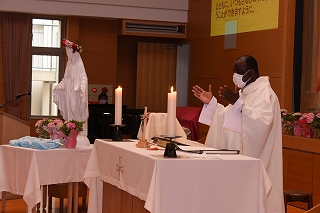 聖書朗読の後、神父様のお話を聞きました。自分のことよりも周りの人のことを気遣い、祈ってくださるマリア様についてお話しくださいました。