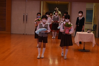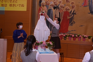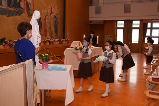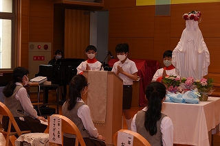 祈りのひとときが始まりました。学年の代表児童がお祈りのカードとお花のささげものを持って入場し、マリア様にささげていきます。最後は、マリア様にばらの冠をささげます。