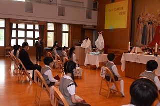 低学年の祈りの集い、高学年のミサともにヴィアトール修道会のウィリアム神父様が司式してくださいました。高学年は代表の児童が聖書朗読を行います。