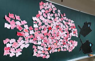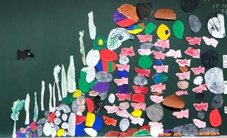 スイミーのお話の理解を深めるために、子ども達が5つに分けた物語の場面を黒板に表現しました。