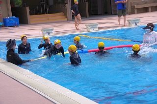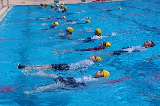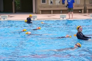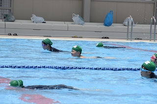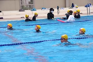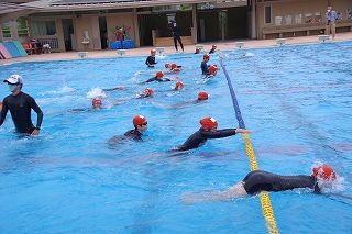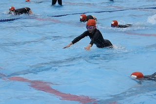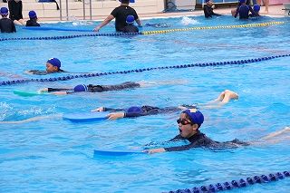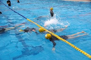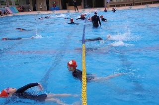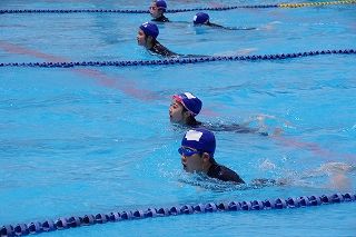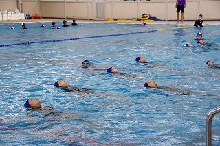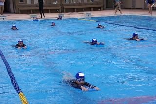 通常のプールより横幅が大きく正方形に近い形のプールなので、プールを縦に使ったり横に使ったりします。コースロープをくぐって行き、越えて帰ってくるという指示も出ます。